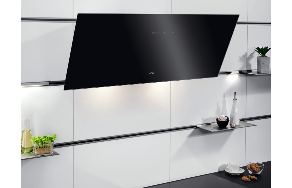 A Wall Mounted AEG Chimney Hood in Black.