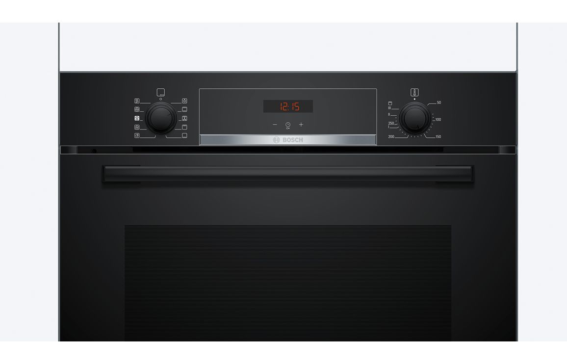 A built in Bosch single electric oven in black.