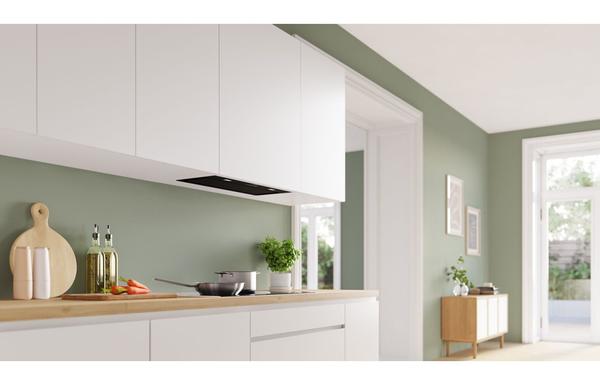 Seamless integration: thanks to flush installation the canopy hood is almost invisible in upper cabinets.
