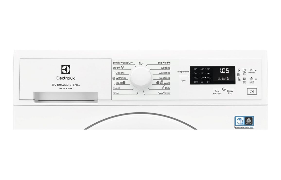 A Free Standing Electrolux Washer Dryer in White.