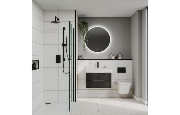 White silk wall panels – classic clean and work well with everything! The perfect mix and match décor. The black grout line allows you to pair and style you black finishings to add a sophisticated feel to the bathroom.