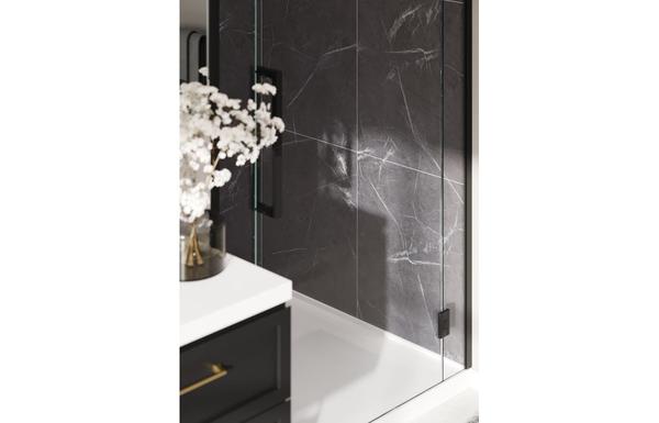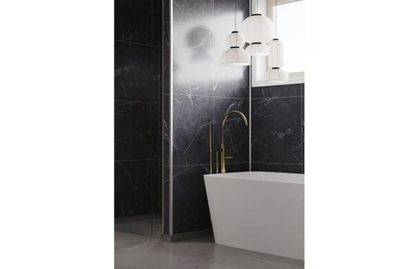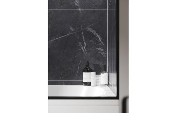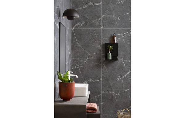 This design is a modern marble effect. It's bold and classy and adds a touch of sophistication to any bathroom. The 60 x 60 cm tile effect makes this decor look great as a whole room covering or a feature wall.