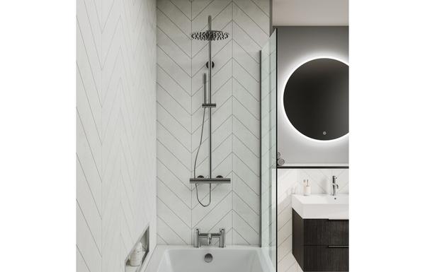 This décor is stylish versatile and classy. It's the perfect decor to be paired with light and natural colours to add a touch of personality into your room. Can be used in any size bathroom the chevron design helps create the illusion of a tall ceiling in a small space. Also comes in tile-effect.