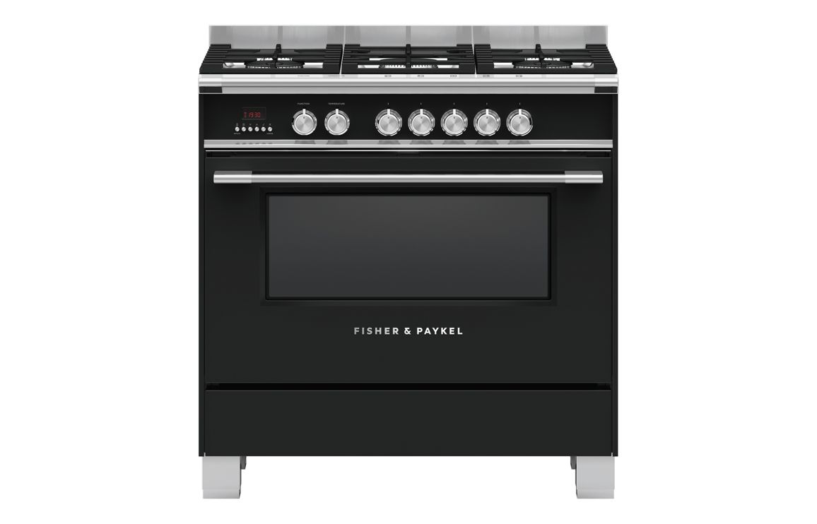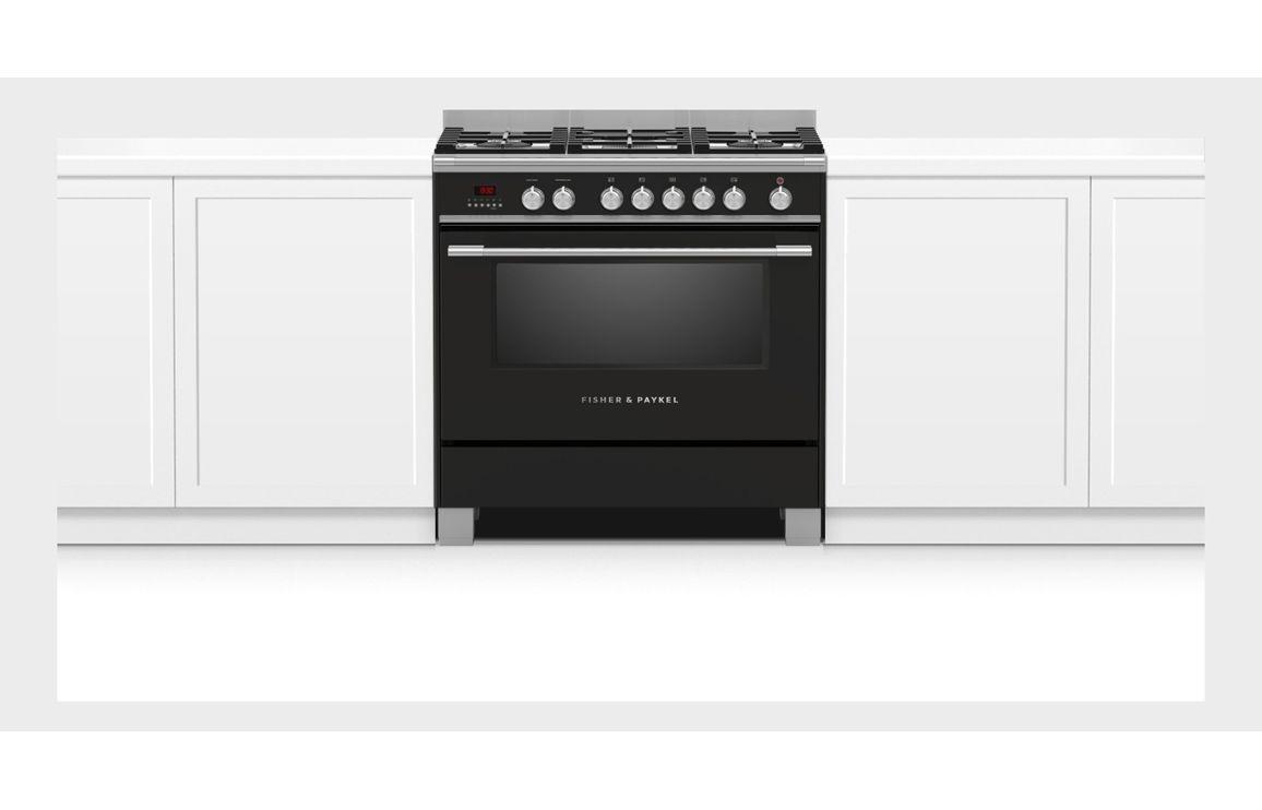 A Free Standing Fisher & Paykel Dual Fuel Cooker in Black.
