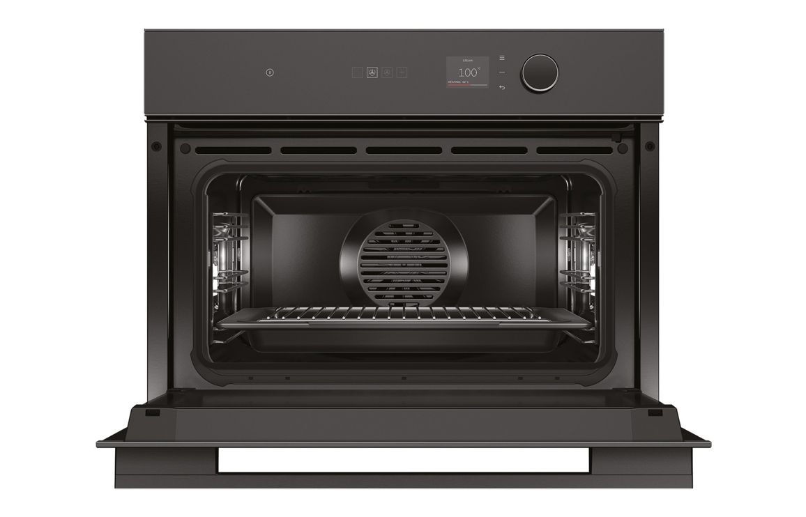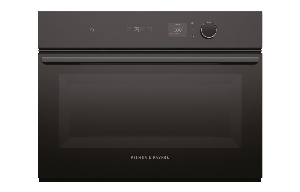 A built in Fisher & Paykel compact steam oven in black.