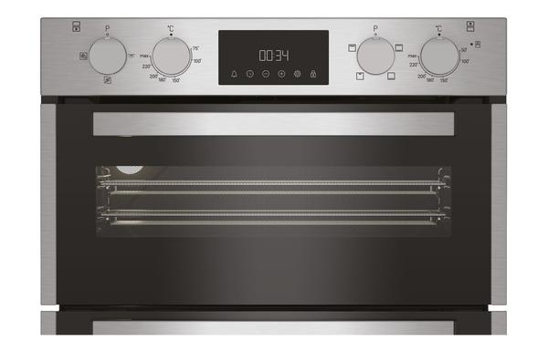 A built under Hotpoint double electric oven in stainless steel.