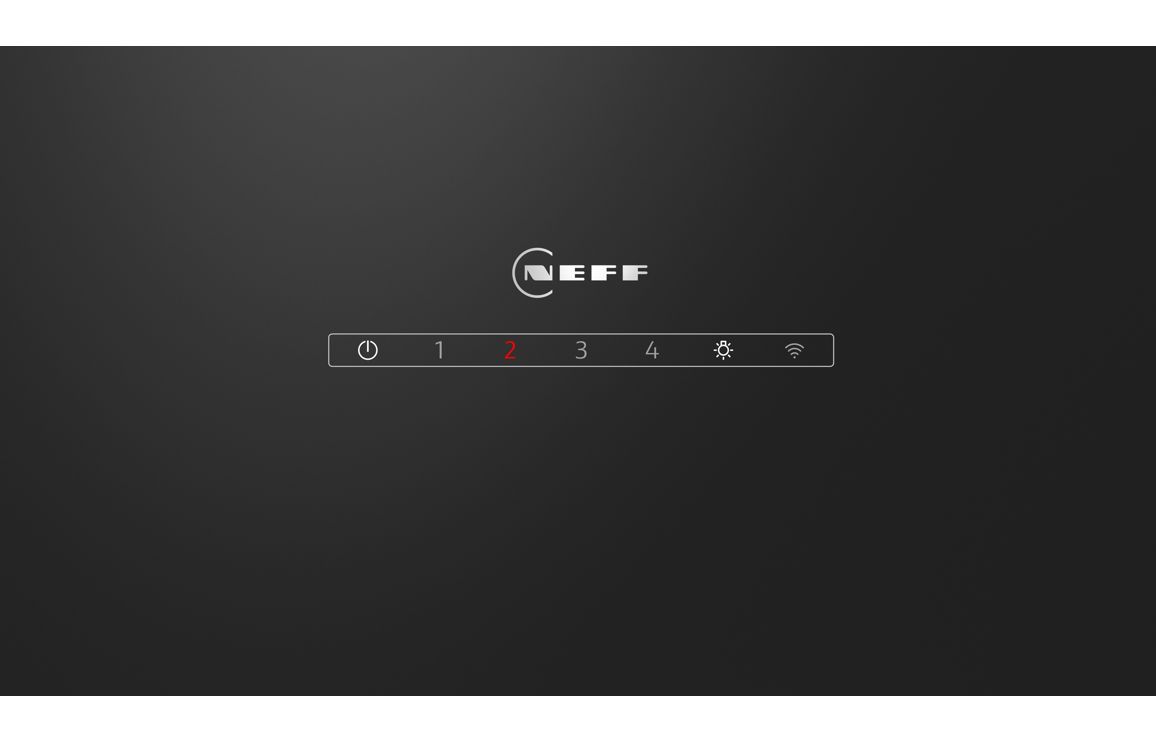 A Wall Mounted Neff Chimney Hood in Black Glass.