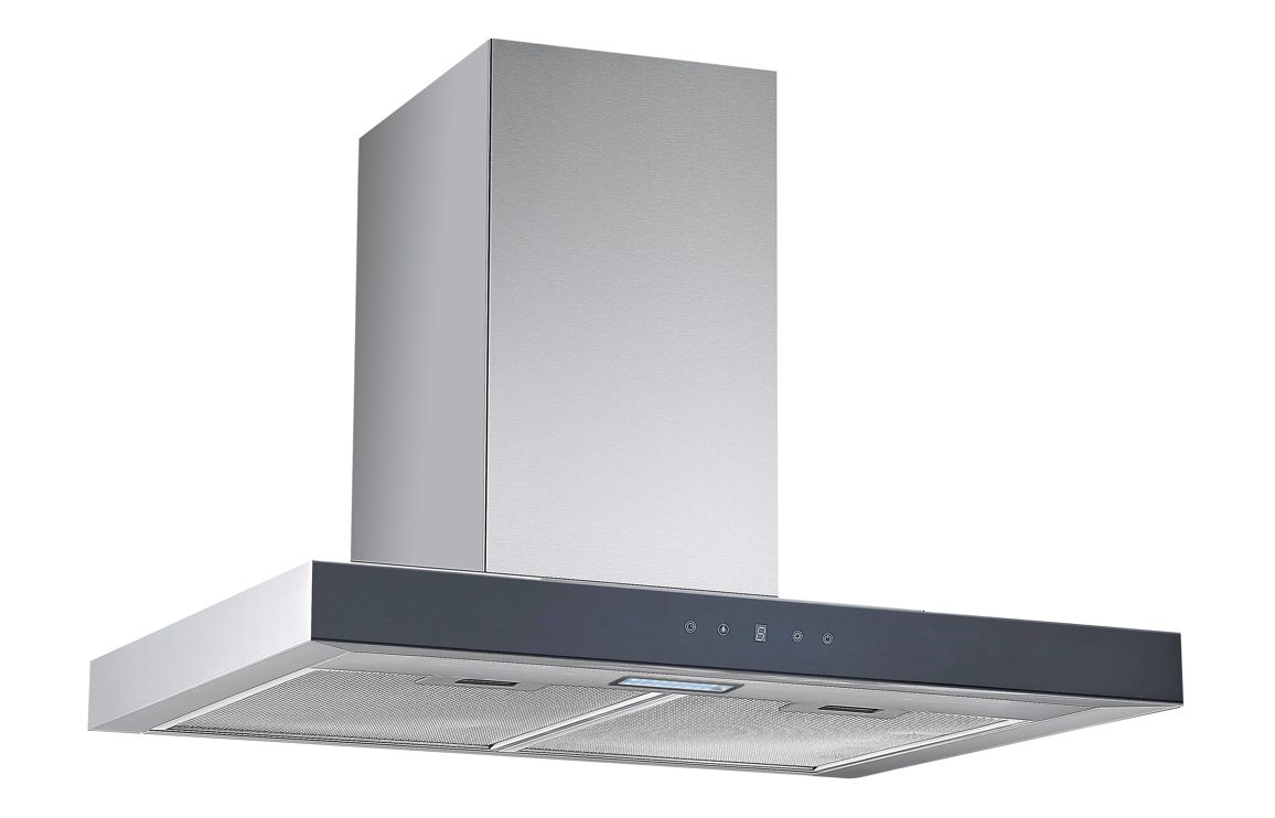 A Wall Mounted Prima Chimney Hood in Black & Stainless Steel.