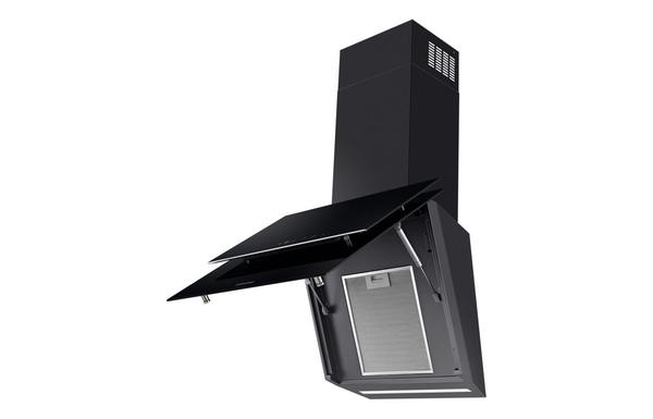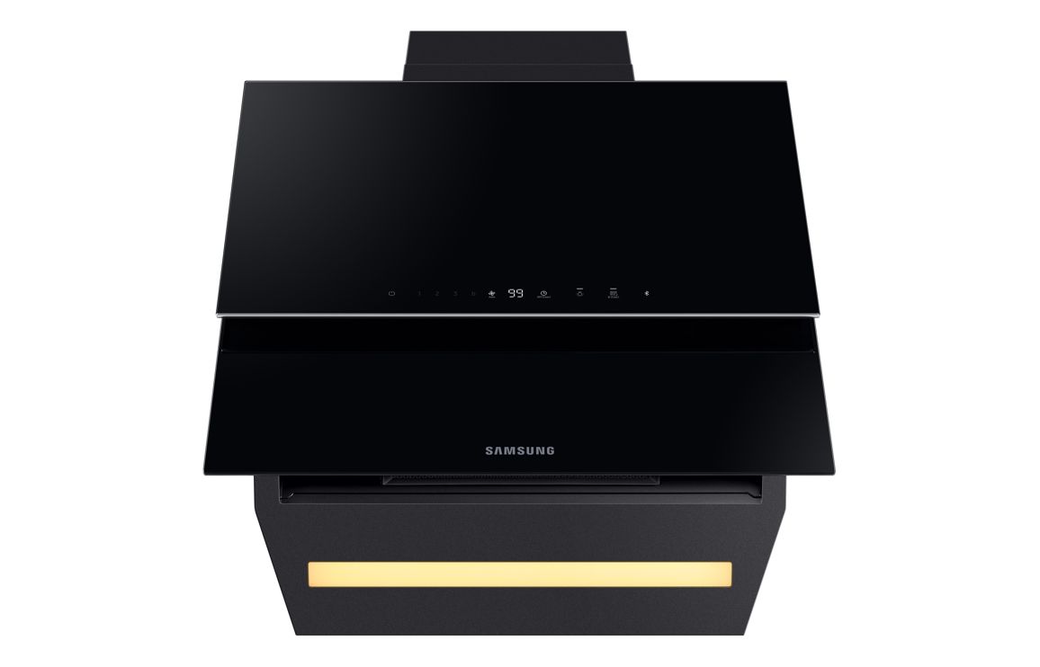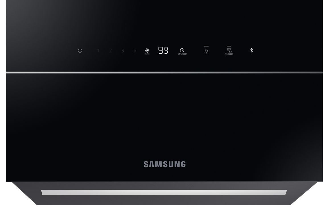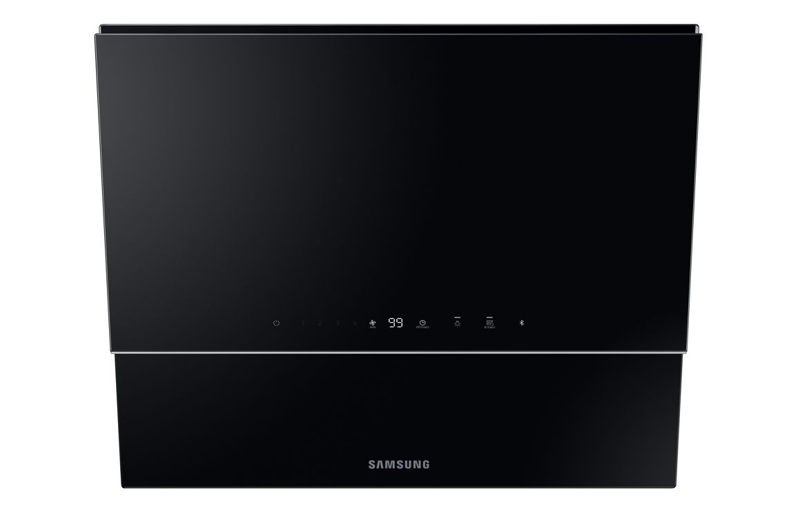 A Wall Mounted Samsung Chimney Hood in Black glass.