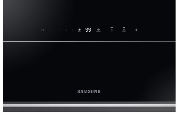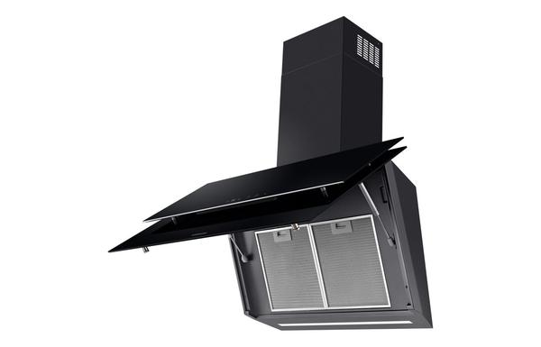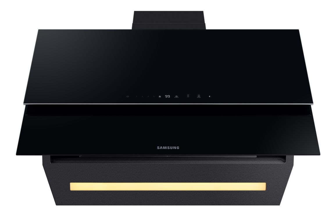 A Wall Mounted Samsung Chimney Hood in Black glass.