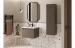 Textured handleless furniture with soft horizontal fluted lines and a wrap around drawer box.