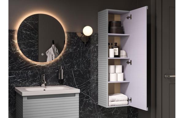 Textured handleless furniture with soft horizontal fluted lines and a wrap around drawer box.