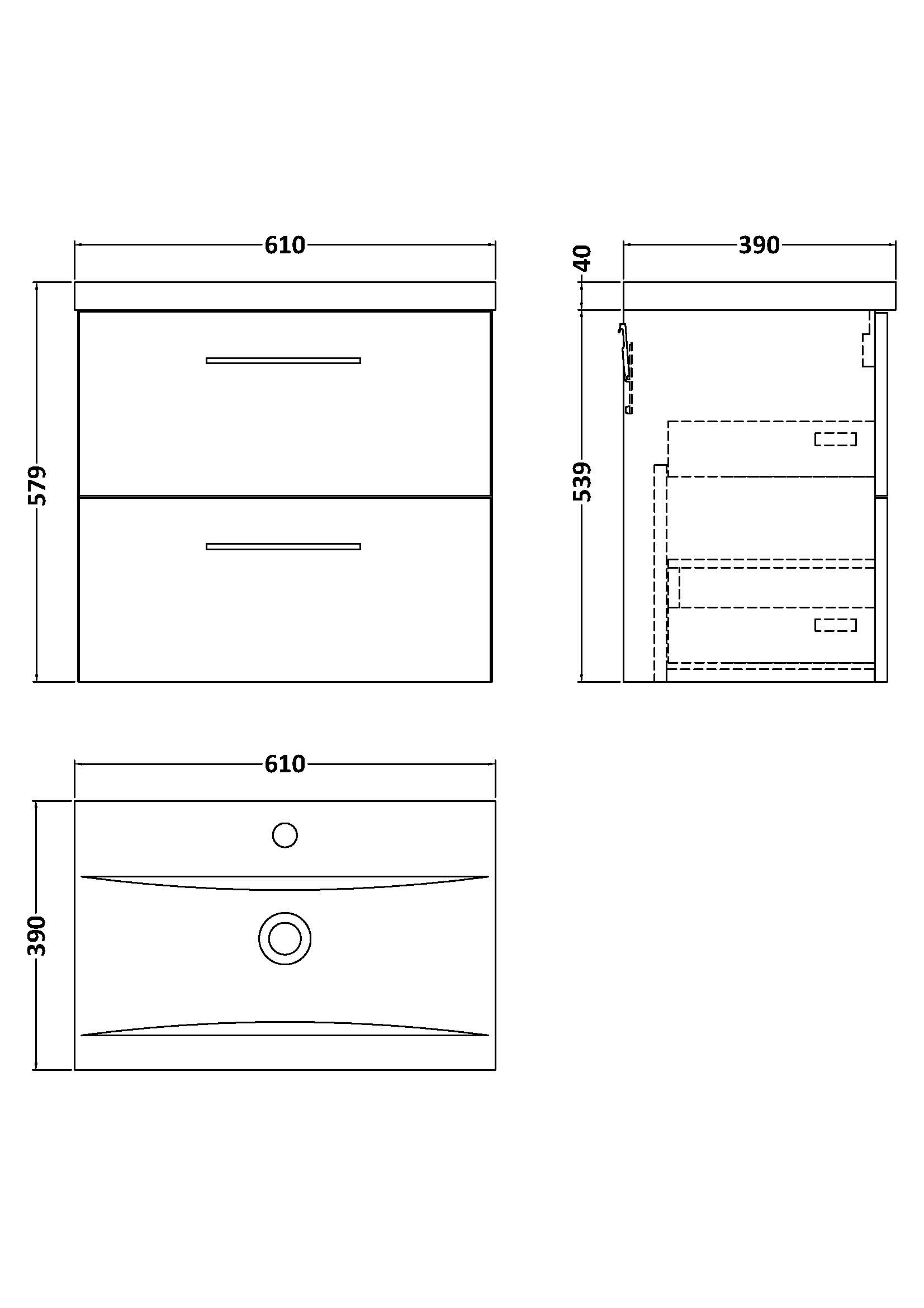 600mm Wall Hung 2 Drawer Vanity & Basin 1