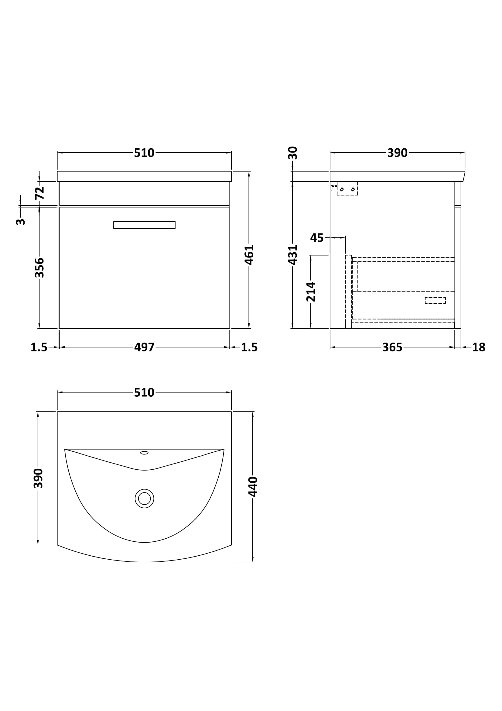 Nuie Athena 500mm Wall Hung Single Drawer Vanity Unit With 1 Tap Hole Basin