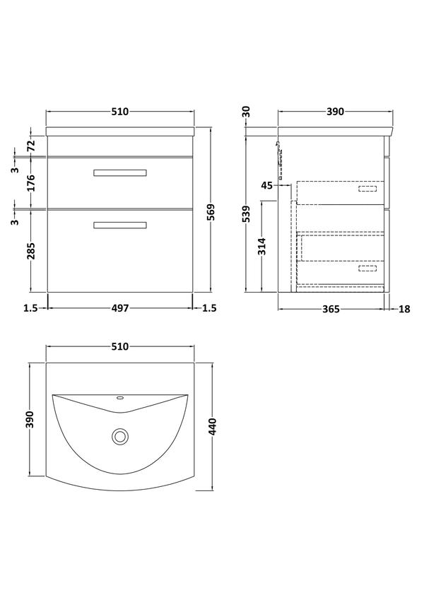 Nuie Athena 500mm Anthracite Woodgrain Wall Hung 2 Drawer Vanity Unit With 1 Tap Hole Basin