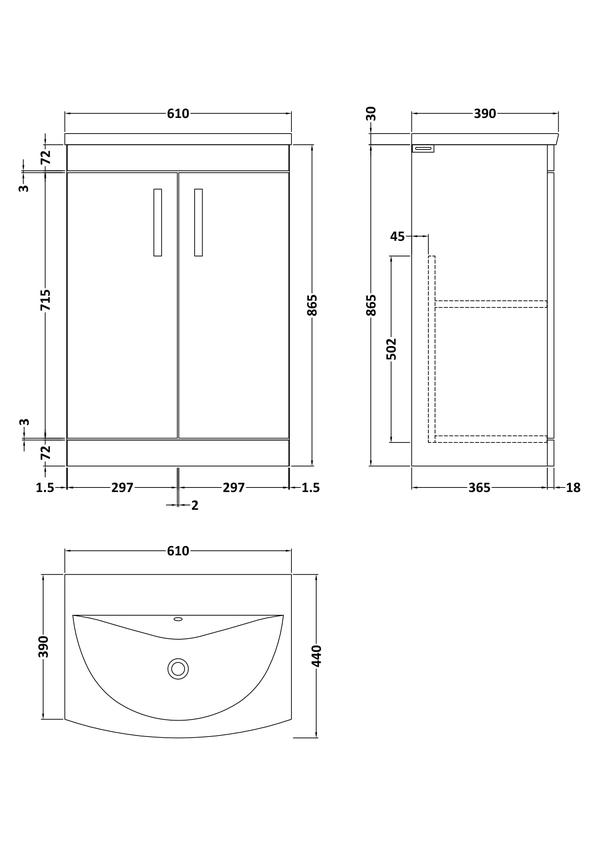 Nuie Athena 600mm Charcoal Black Floor Standing 2 Door Vanity Unit with Curved 1 Tap Hole Basin by Ultra