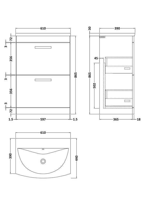 Nuie Athena 600mm Charcoal Black Floor Standing 2 Drawer Vanity Unit with 1 Tap Hole Basin