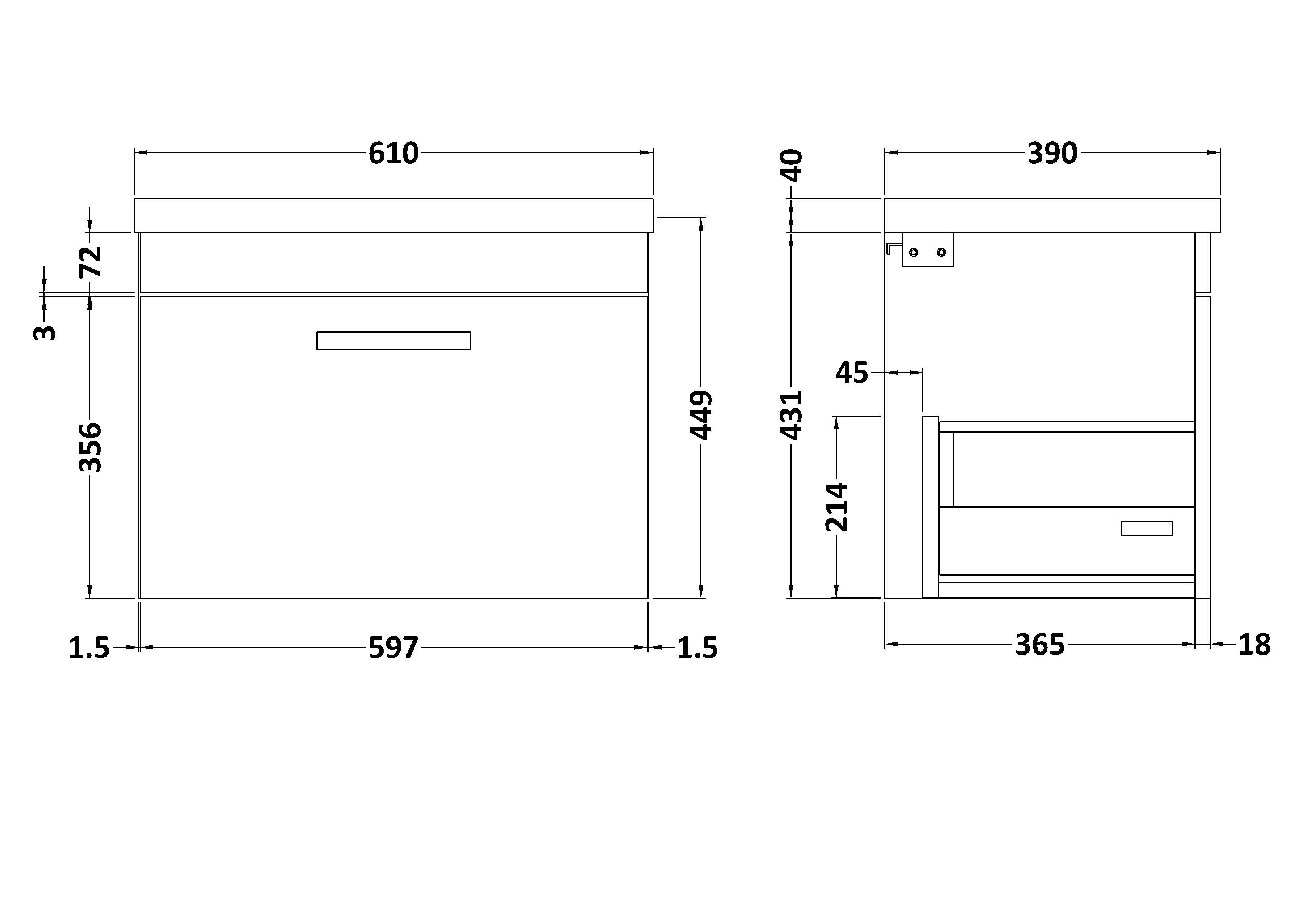 Nuie Athena 600mm Wall Hung Anthracite Woodgrain Single Drawer Vanity Unit With 1 Tap Hole Basin