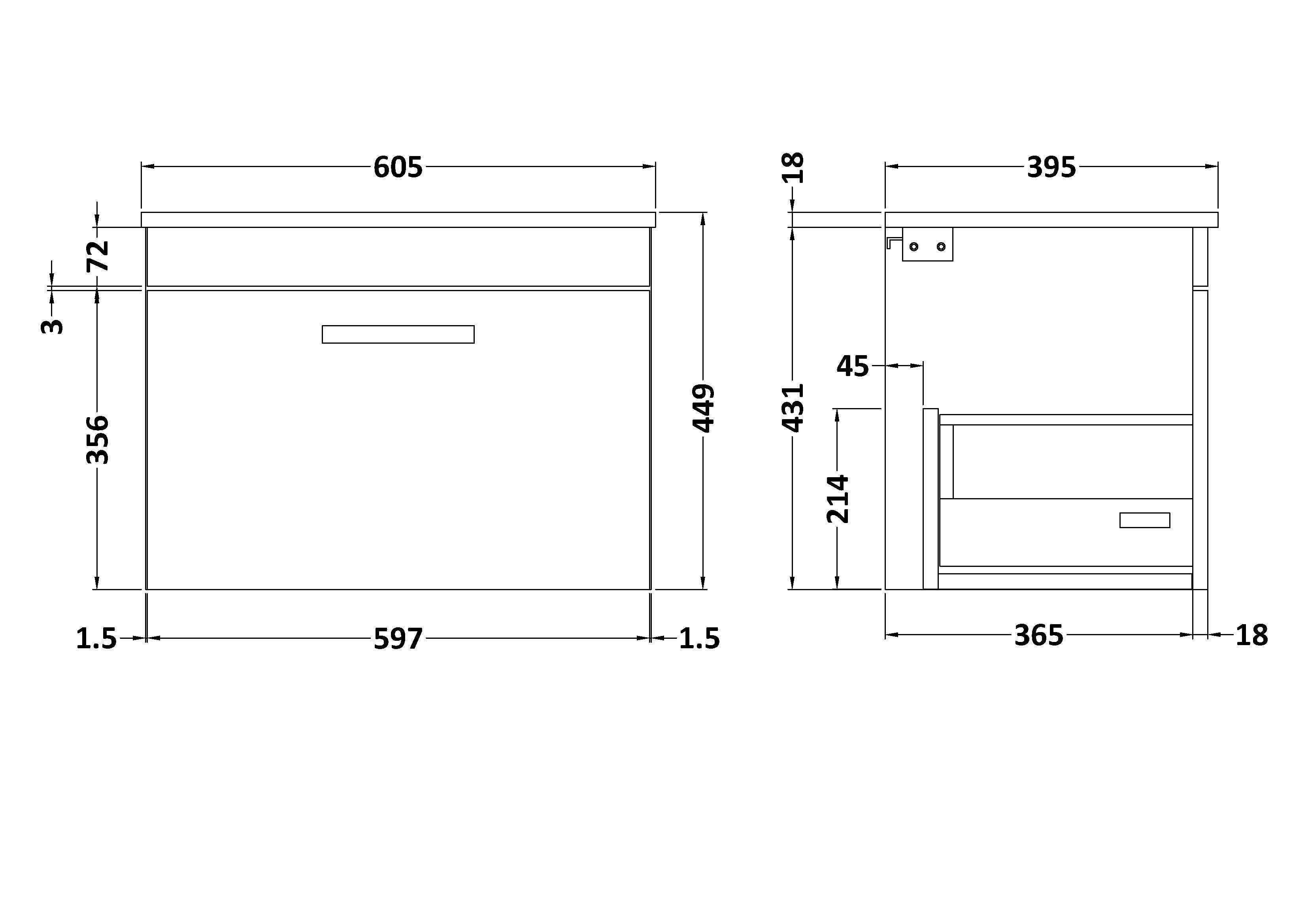 Nuie Athena 600mm Wall Hung Single Drawer Vanity Unit With 1 Tap Hole Basin