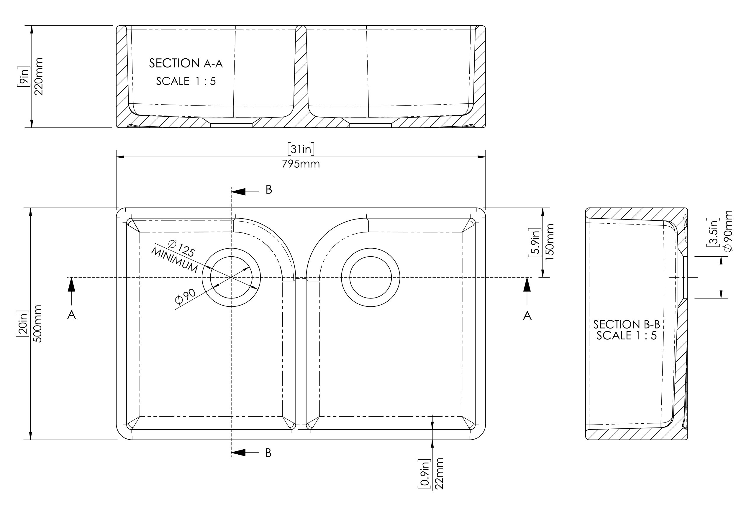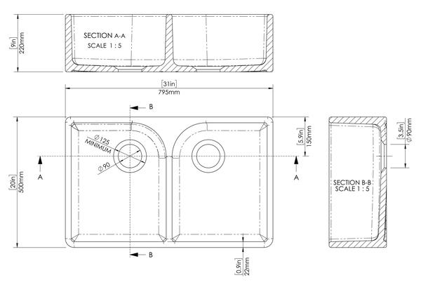 Fireclay Butler Sink Flush Weir 795 x 500 x 220mm