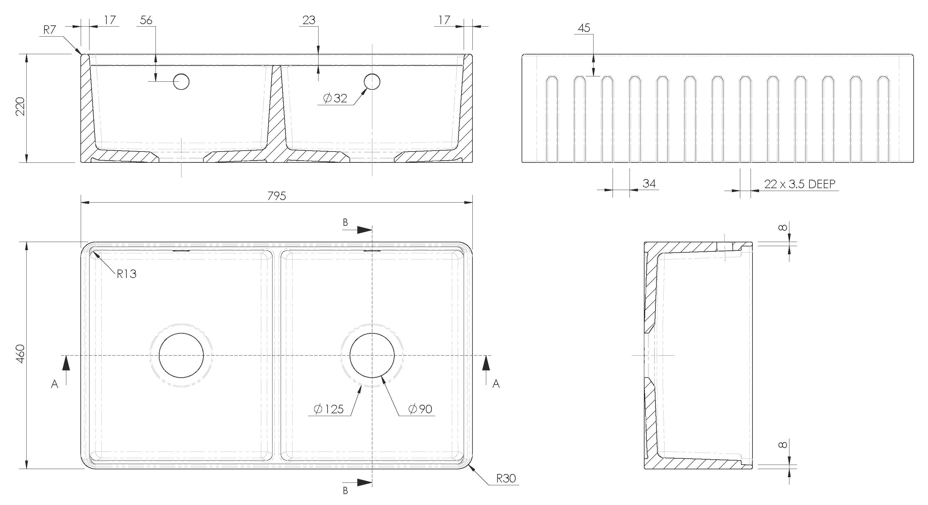 Fluted Double Bowl Butler Sink with Ledge 795 x 460 x 220mm