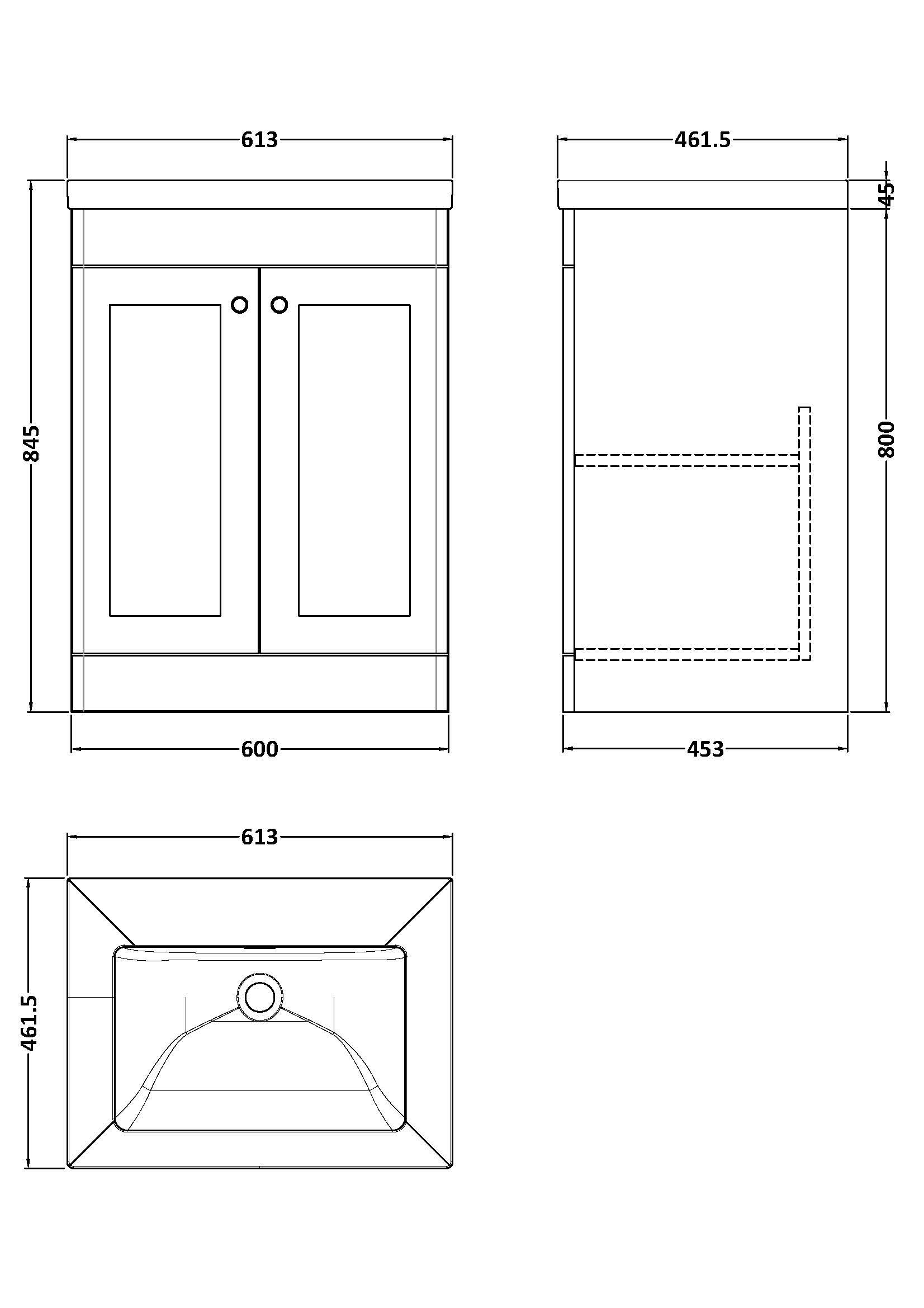600mm Floor Standing 2-Door Vanity with Basin - 0 Tap Hole