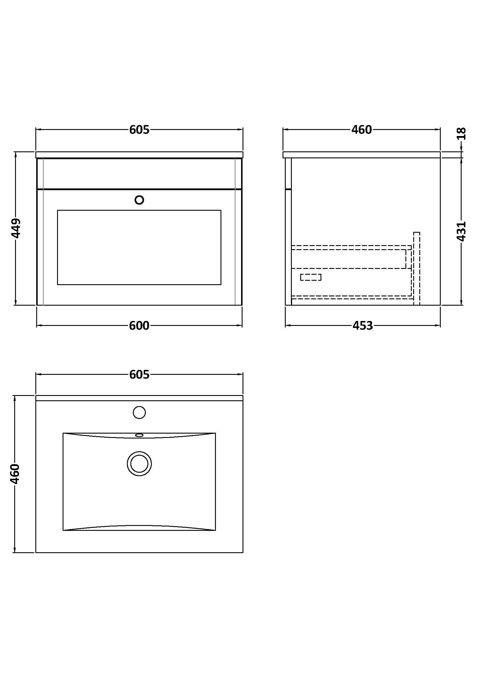 600mm Wall Hung 1-Drawer Vanity with Basin - 1 Tap Hole