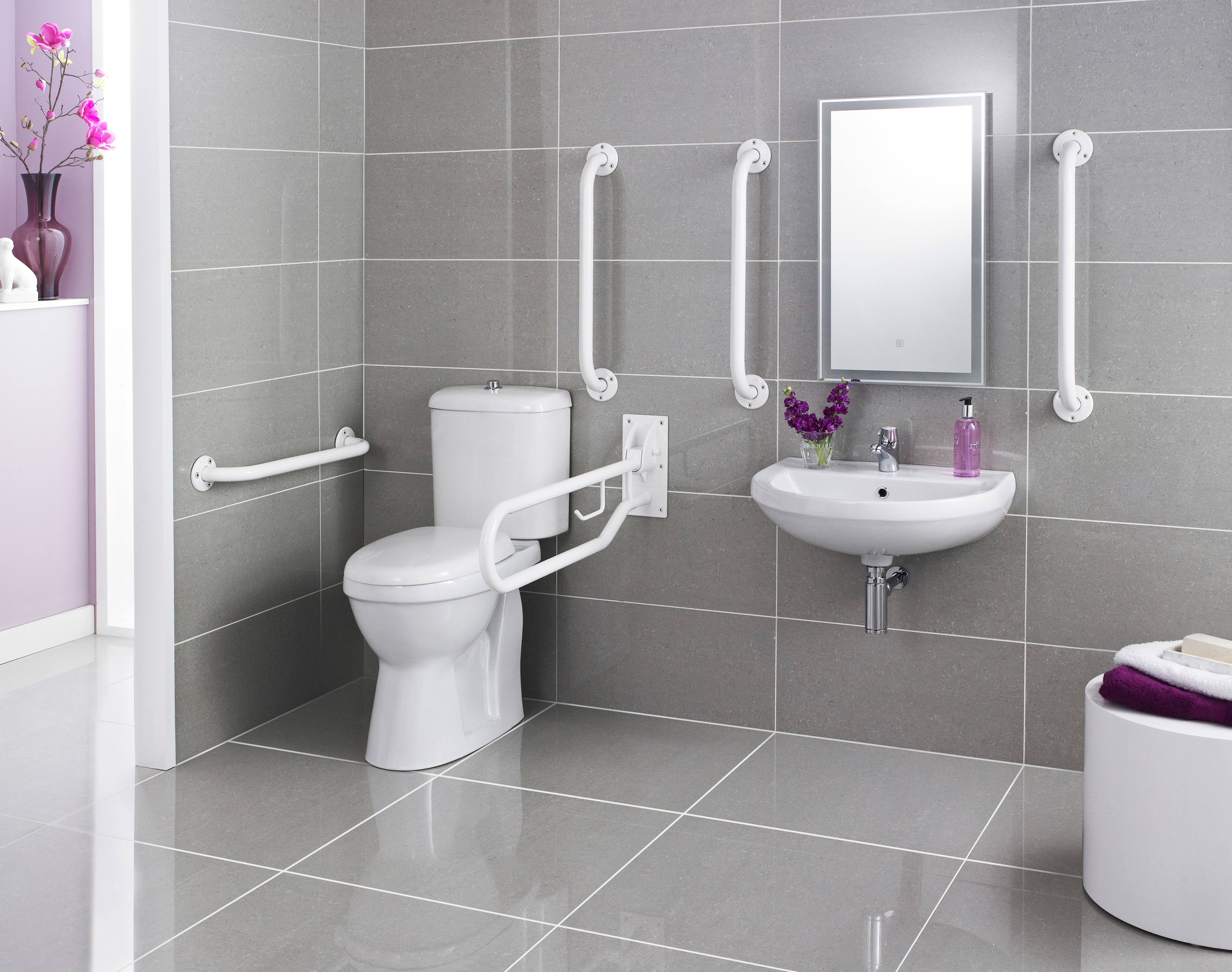 Includes; Comfort Height Doc M Pan, Doc M Cistern, Toilet Seat, Wall Mounted Basin, 5 Grab Rails (5th rail to be fitted to the back of the door), 1 Drop-down Rail & Spray Mixer Tap.