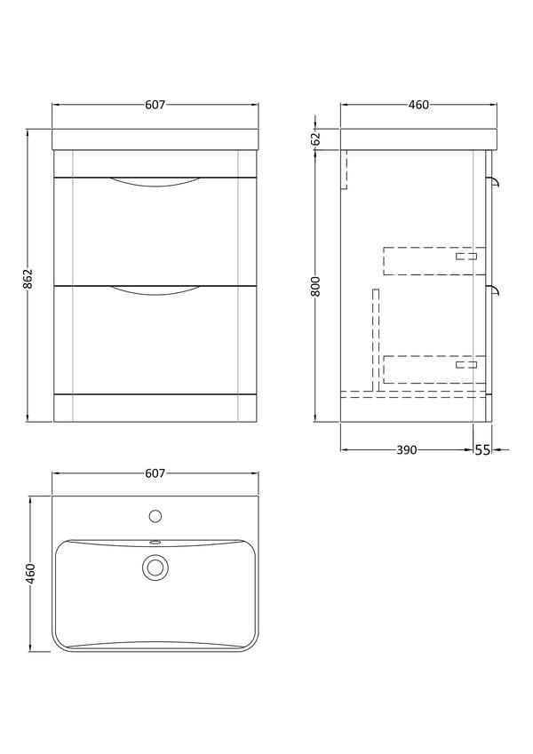 Nuie 600mm Gloss White Floor Standing 2 Drawer Vanity Unit With Ceramic Basin