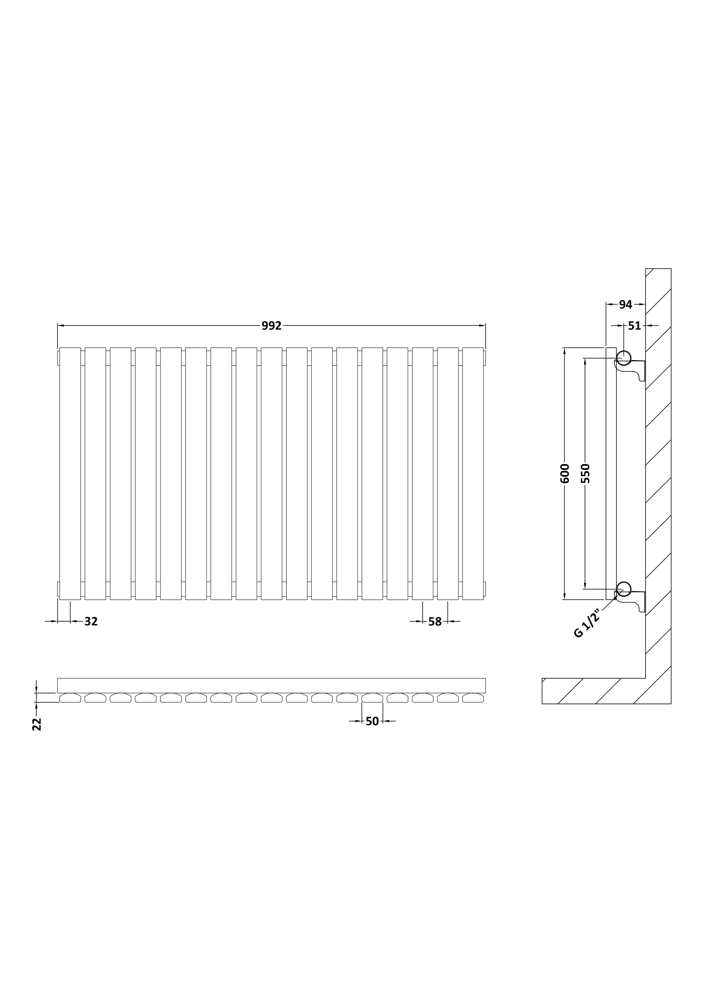 Horizontal Single Panel Radiator 600 x 992 by Ultra