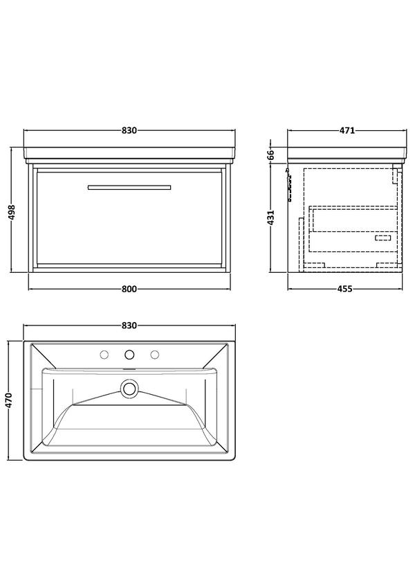 Hudson Reed Lille 830mm Coastal Grey Wall Hung Single Drawer Vanity Unit with 3 Tap Hole Basin by Ultra