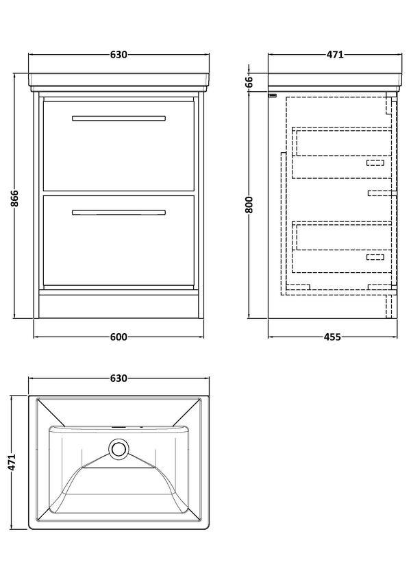 Lille 600mm Floor Standing 2-Drawer Vanity with Basin - 0 Tap Hole
