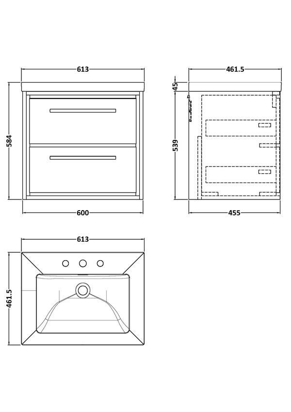 Lille 600mm Wall Hung 2-Drawer Vanity with Basin - 3 Tap Hole