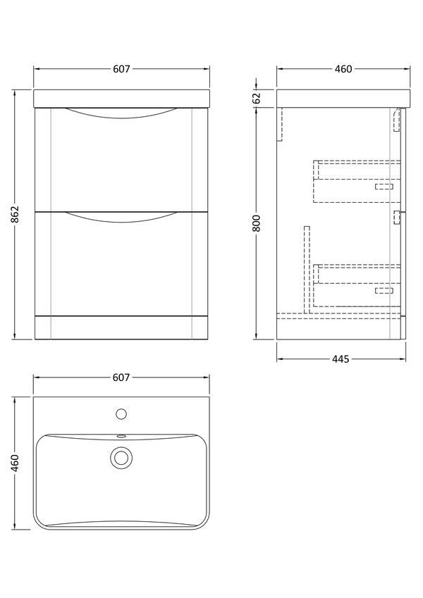 Nuie Lunar 600mm Satin Grey Floor Standing 2 Drawer Vanity Unit With Thin Edge Ceramic Basin
