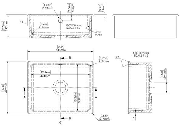 Undermount Single Bowl with Overflow & Central Waste 548x442x197