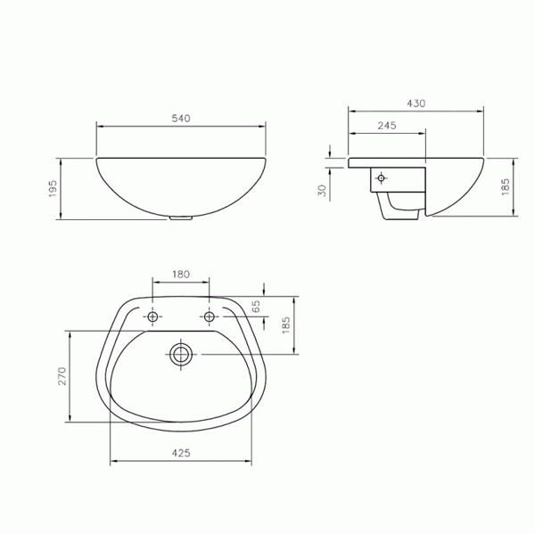 Shires semi-recessed basin with 2 tap holes.